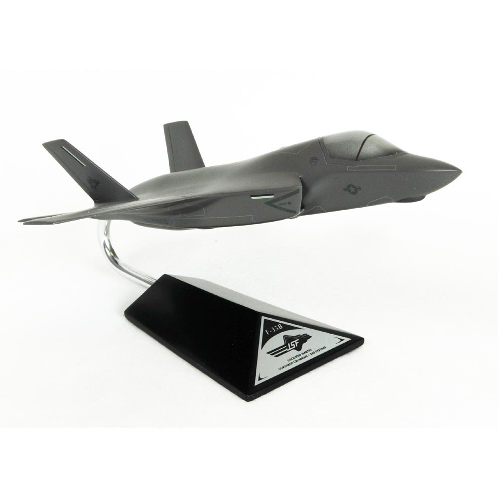 This high quality replica is crafted from resin and comes with a wooden base. Length is 12-3/4" and wingspan is 8-1/2". Scale is 1/48. he F-35B, a variant of the F-35 Lightning II, is the Short Takeoff and Vertical Landing (STOVL) aircraft. This takeoff and landing operation succeeds through a very innovative technology known as the shaft-driven lift fan propulsion system. Besides the propulsion system, the STOVL variant differs only slightly from the US Air Force variant. The short takeoff/vertical landing (STOVL) F-35B will replace the aging AV-8B Harrier STOVL attack jets (which have also proven increasingly difficult to support) of the US Marine Corps, as well as its F/A-18s. The F-35B will have a stealthy, belly-mounted 25 mm missionized gun pod and a combat radius of more than 450 NM- nearly two times that of legacy STOVL strike fighters. A shaft-driven lift fan, in combination with a vectoring rear exhaust nozzle, gives this fighter the ability to take off in short distances, accelerate to supersonic speeds in level flight, and land vertically. Thanks to the lift-fan system, the F-35Bs total vertical lifting thrust is about 39,700 pounds (the aircraft weighs about 30,000 pounds)- more than 14,000 pounds greater than the engine alone would produce without the lift fan. The F-35B will be the worlds first operational supersonic STOVL aircraft. The F-35B is similar in size to the Air Force F-35A, trading fuel volume for vertical flight systems. Like the AV-8 Harrier II, guns will be carried in a ventral pod. Vertical flight is by far the riskiest, and in the end, a decisive factor in design. |