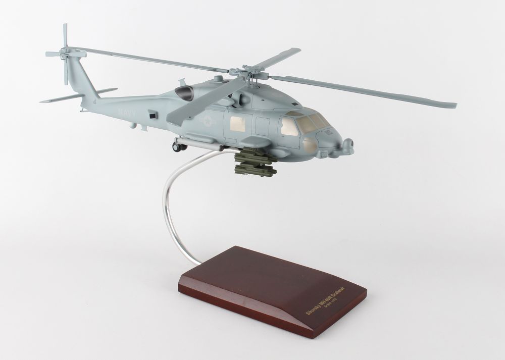 This high quality replica is handcrafted from mahogany and comes with a wooden base. Length is 18 3/8" and wingspan is 16 1/4". The Sikorsky MH-60R Seahawk multi-mission helicopter is the newest aircraft in the US Navys fleet. It is replacing SH-60B and SH-60F helicopters and combines the capabilities of these aircraft. The helicopter is equipped for a range of missions including: anti-submarine warfare (ASW), anti-surface warfare (ASuW), search and rescue (SAR), naval gunfire support (NGFS), surveillance, communications relay, logistics support, personnel transfer and vertical replenishment (VERTREP). For vertical replenishment missions the helicopter is fitted with a 2,721.55kg (6,000lb) cargo hook. Lockheed Martin, Owego, is the mission systems integrator. The maiden flight of the MH-60R took place in July 2001. The first low-rate initial production (LRIP) helicopters were remanufactured SH-60Bs but following MH-60Rs are all new-build. The first new production MH-60R helicopter was delivered in August 2005. Operational evaluation (OPEVAL) was completed in October 2005 and full-rate production approved in April 2006. Production levels are planned to increase to up to 30 helicopters a month. The US Navy expects to operate 252 MH-60R helicopters by 2015. |