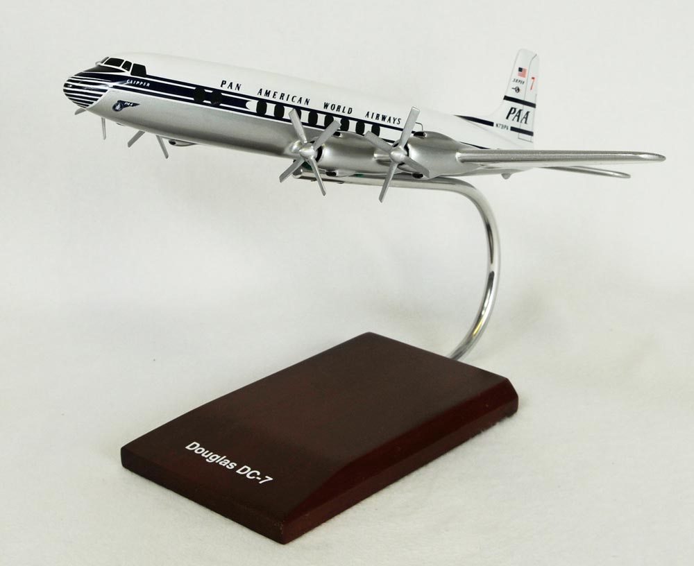 The DC-7 is an American aircraft built by Douglas Aircraft company in 1953 to 1958 and was the last major piston engine powered transport of Douglas. The early DC-7s were only sold to US carriers. The extended range variant of the DC-7, the DC-7C ""Seven Seas"" was released by the Douglas Aircraft since European carriers could not take advantage of he small range increase in the early DC-7. Pan American Airlines used the DC-7C aircraft to inaugurate the first non-stop New York-London service. Pan Am flew the DC-7Cs for only two and and a half years before entering the jet age. The DC-7 is the largest propeller transport aircraft that Pan Am has ever used. The DC-7C was also used by several other overseas airlines fleets. In 1959, Douglas began converting DC-7A and DC-7C aircraft into DC-7F freighters, extending the life of the aircraft past its viability as a passenger transport. |