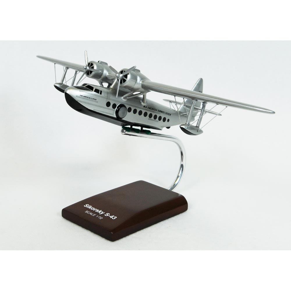 S-43 is an amphibious aircraft manufactured by Sikorsky Aircraft in the 1930s. It was also known as the Baby Clipper in airline service. The S-43 was a smaller version of S-42 flying boat. The S-43 was used primarily by Pan American World Airways. Pan American Airways used the S-43 in Caribbean and South American routes. The S-43 was also operated by other airlines including Norway, West Africa, Russia, China, Hawaii and Philippine islands. There were 15 S-43s used primarily by the Navy as utility transports and some were also assigned to the Army and the Marines. The S-43 incorporates two Pratt & Whitney R-1690-52 radials with 750 hp each. It has a crew of two pilots and a seating capacity of 15 passengers. It has a maximum speed of 190 mph and a range of 775 miles. |