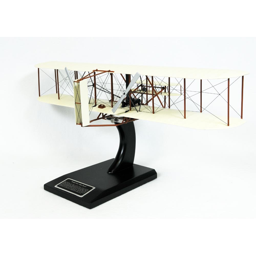 The Wright Flyer, also referred to as Flyer I and Kitty Hawk, was the first successful powered, piloted, controlled heavier-than-air aircraft. It was designed and built by brothers Orville and Wilbur Wright, and was based on their 1902 Glider. The Flyer was made of spruce and ash covered with muslin. Since the brothers could find no suitable automobile engine for the task, they commissioned their employee Charlie Taylor to build a new one from scratch. A sprocket chain drive, borrowed from bicycle technology, powered the twin propellers, which were also made by hand. The basic problems of mechanical flight, lift, propulsion and control were solved in the Wright design. The Flyer was a canard biplane configuration. The pilot flew lying on his stomach on the lower wing, with his head toward the front of the aircraft and his left hand operating the elevator control. Lateral control was achieved by warping the wing tips in opposite directions via wires attached to a hip cradle mounted on the lower wing. The pilot shifted his hips from side to side to operate the mechanism, which also moved the rudder. The Flyer's “runway� was a track of 2x4's stood on their narrow end, which the brothers nicknamed the “Junction Railroad�. On December 14, 1903, after practicing on the 1902 Glider, the brothers felt ready for their first attempt at powered flight. They tossed a coin to decide who would get the first chance at piloting, and Wilbur won the toss. However, he pulled up too sharply, stalled, and brought the Flyer back down with minor damage. The plane was ready again after three days of repairing. On December 17, 1903, at Kitty Hawk, North Carolina, the Wright Flyer achieved controlled, sustained flight. With Orville at the controls, the plane took off from a launching rail and flew for 12 seconds and a distance of 120 feet. The airplane was flown three more times that day, with the brothers alternating turns. Wilbur made the longest flight, flying for 59 seconds and 852 feet. |