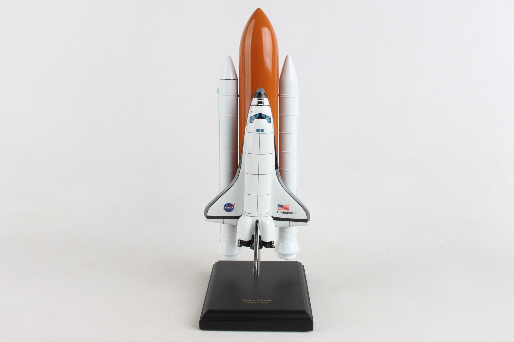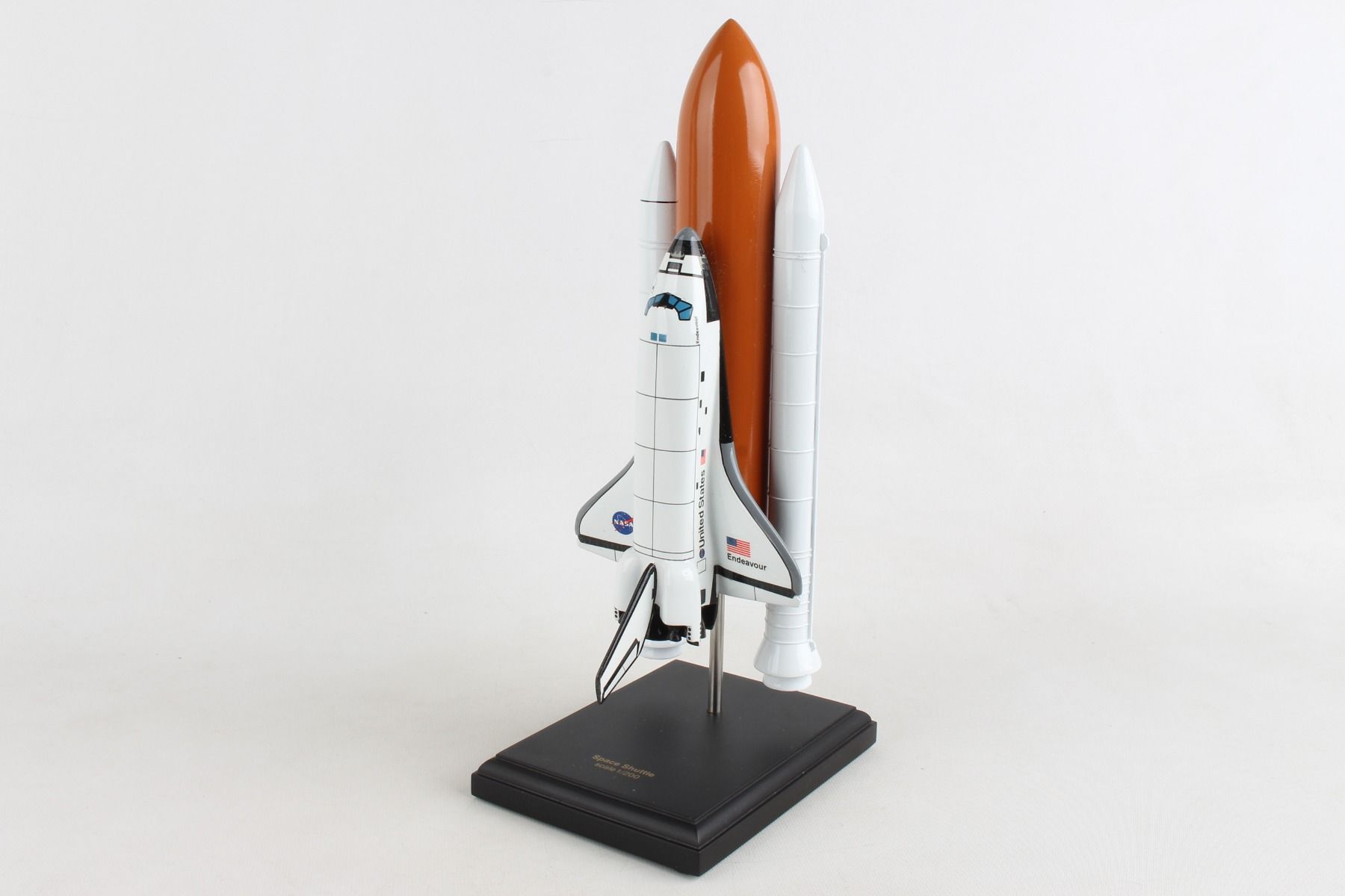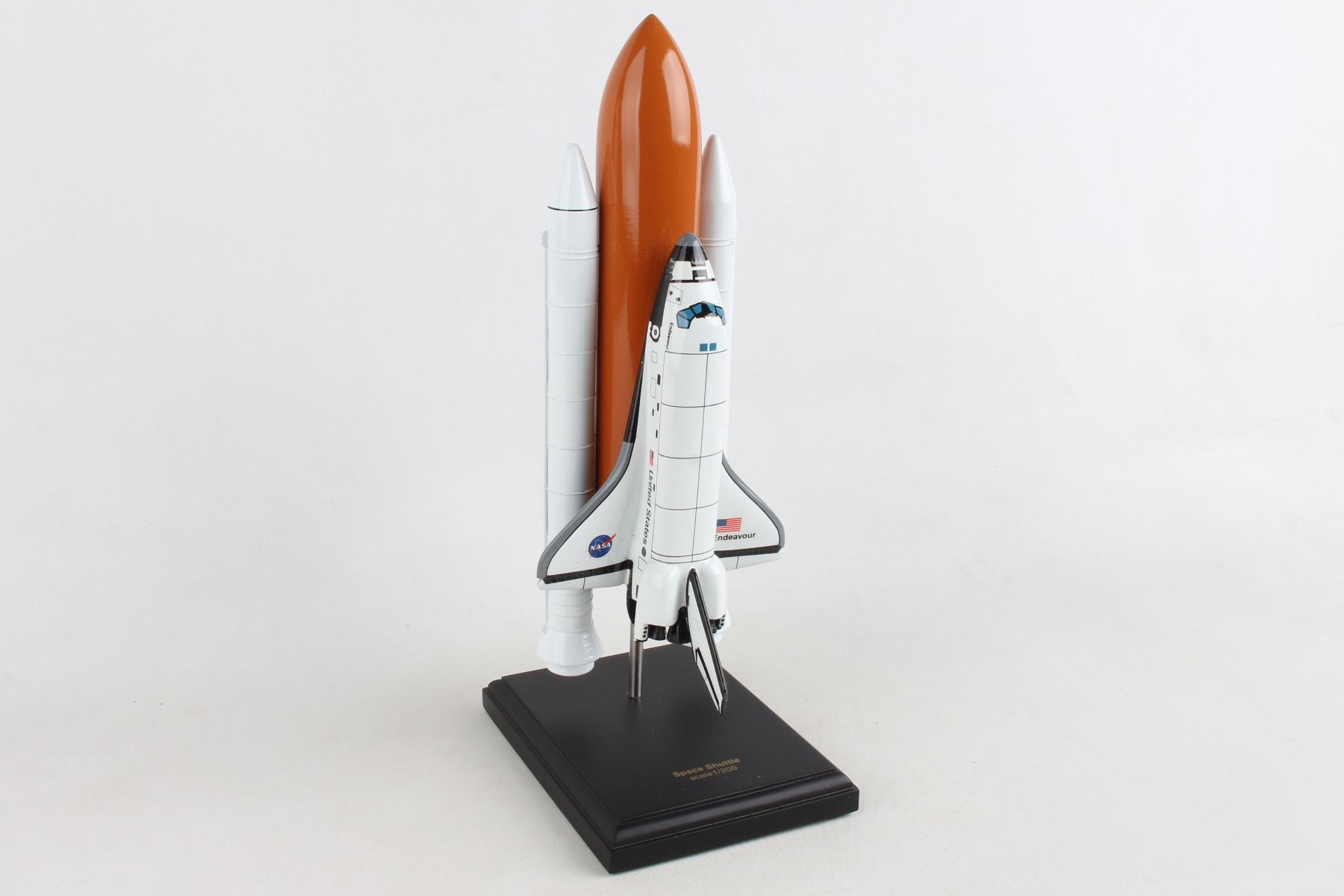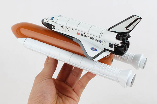 The Space Shuttle was NASA's partially reusable low Earth orbital spacecraft. It included the Orbiter Vehicle, a pair of recoverable solid rocket boosters (SRBs), and the expendable external tank containing liquid hydrogen and liquid oxygen. The Shuttle was launched vertically, like a conventional rocket, with the two SRBs operating in parallel with the OV's three main engines, which were fueled from the ET. NASA made 6 Orbiter vehicles and named them, in order: Enterprise, Columbia, Challenger, Discovery, Atlantis, and Endeavour. The Space Shuttle was retired from service upon the conclusion of Atlantis's final flight on July 21, 2011. This high quality replica is crafted from plastic and comes with a wooden base. Length is 11" and wingspan is 4-1/2" |