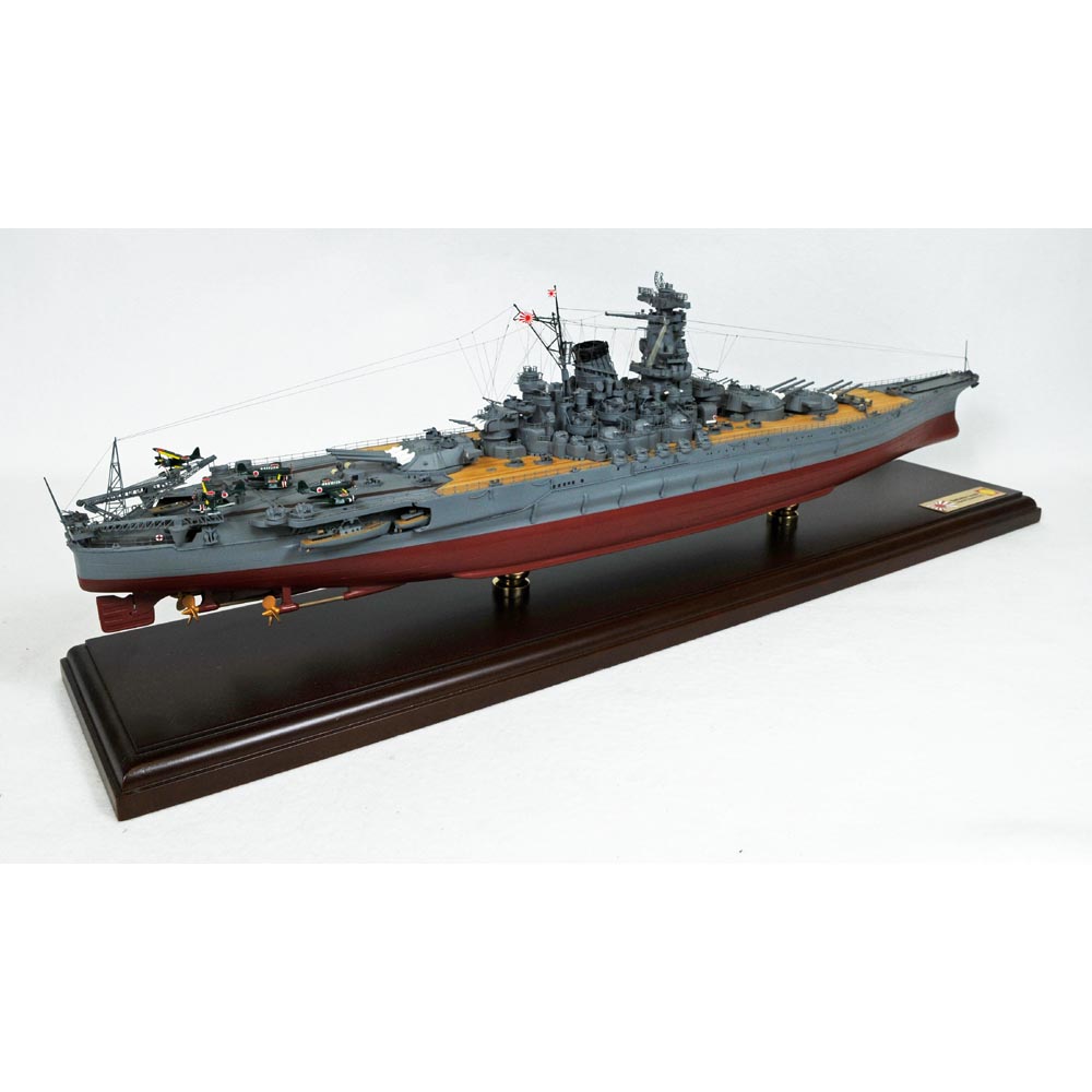 Length is 30" and beam is 4 1/4". Scale is 1/350. The Yamato class battleships of the Imperial Japanese Navy were the largest naval vessels during World War II. Yamato, together with Musashi, made little impact during World War II. In October 1944, Yamato opened on US escort carriers and destroyers and it was the first and last of its battles with enemy ships. It has seen little action during the past four years. Yamato was sent on a planned suicide mission against the U.S. Navy forces attack on Okinawa. On April 7, 1945, Yamato was hit by successive waves of US carrier based aircraft and sank after absorbing 8 bombs and 13 torpedo hits. Out of 3332 crew, fewer than 300 onboard survived. The Yamato has a speed of 27 knots and a range of 7,200 nautical miles at 16 knots. |