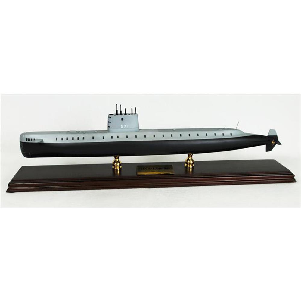 USS Nautilus SSN-571 is the worlds first nuclear-powered submarine and was the first vessel to complete a submerged transit across the North Pole. Its propulsion system was a landmark in the history of naval engineering and submersible craft. During Nautilus long career, it has established many historic firsts. On May 10, Nautilus headed for a shakedown and its longest submerged cruise was when it traveled 2,100 km from New London to San Juan, Puerto Rico. From 1955 to 1957, Nautilus continued to be used to investigate the effects of submerged speeds and endurance. On February 4, 1957, Nautilus logged its 60,000th nautical mile (111,120 km). In May, Nautilus departed for the Pacific Coast to participate in coastal exercises and the fleet exercise, operation ""Home Run,"" which acquainted units of the Pacific Fleet with the capabilities of nuclear submarines. On July 21, Nautilus returned to New London, Connecticut and departed on August 19 for its first voyage of 2,226 km (1,202 nmi) under polar pack ice. In early 1959, Nautilus completed its first overhaul on May 1959 - August 1960. On October 24, Nautilus departed New London for its first deployment with the sixth fleet in the Mediterranean Sea and returned to its home-port on December 16. On May 2, 1966, Nautilus returned to its home-port to resume operations with the Atlantic Fleet and log its 300,000th mile underway. In the next year, Nautilus conducted special operations for ComSubLant and then on August 1967, it returned to Portsmouth, and conducted exercises off the southeastern seaboard. On December 1968, Nautilus returned to New London. In 1979, Nautilus set out from Groton, Connecticut for its final voyage, reaching Mare Island Naval Shipyard of Vallejo, California on May 26, 1979. On March 3, 1980, Nautilus was decommissioned and stricken from the Naval Vessel Register. |