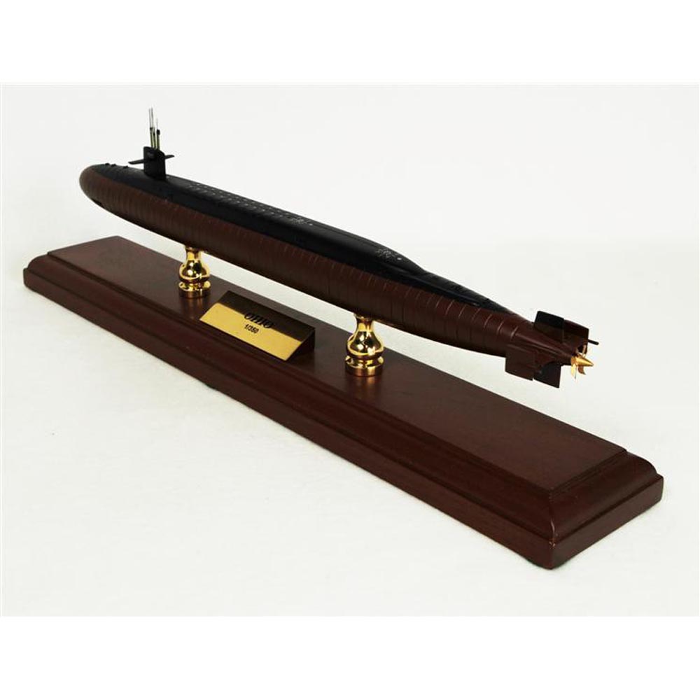 This high quality replica is handcrafted from wood and comes with a wooden base. Length is 19.25" and beam is 1.50". Scale is 1/350. The Ohio Class Ballistic Missile Submarines (SSBN), U.S Navys primary strategic weapon, provides the sea-based leg of the Triad of U.S. strategic forces with the 18 Trident SSBNs each carrying 24 missiles. By virtue of their patrol posture, these submarines are highly survivable; they are also extremely flexible, capable of rapidly retargeting their missiles, should the need arise, using secure and constant at-sea communications links. They are the largest submarines to be built by the United States. The USS Ohio made the first operational patrol of this class in the fall of 1982. The 18th and final ship of this class to be built will be delivered to the Navy in 1997. OHIO Class submarines can carry either the Trident I (C-4) or Trident II (D-5) missiles. In addition, these submarines are fitted with four torpedo tubes for MK 48 torpedoes which, along with countermeasure devices, provide defense against hostile ASW forces. The most important defensive feature of these submarines is their stealth - they are among the quietest nuclear-powered submarines ever built. This inherent feature of the Ohio Class coupled with other characteristics makes these ships the most survivable element of the nuclear Triad. Two complete crews - designated Blue and Gold - are assigned to each Ohio Class submarine. While one crew is at sea operating the submarine, the other is conducting training, attending schools, being evaluated in shore-based simulators and enjoying leave. By alternating the Blue and Gold crews, with a brief turnover period, the submarines can be kept at sea for considerably longer than with a single crew. The nominal operating schedule is 77 days at sea followed by a 35 day turnover/replenishment/refit period. Ohio Class Submarines are specifically designed for extended deterrent patrols. To speed the time in port for crew turnover and replenishment, three large logistics hatches are fitted to provide large diameter re-supply and repair openings. These allow the rapid transfer of supply pallets, equipment replacement modules, and even machinery components, significantly reducing the time required for replenishment and maintenance. The OHIO design and modern maintenance concepts permit the submarines to operate for over 12 years between major shipyard availabilities. |