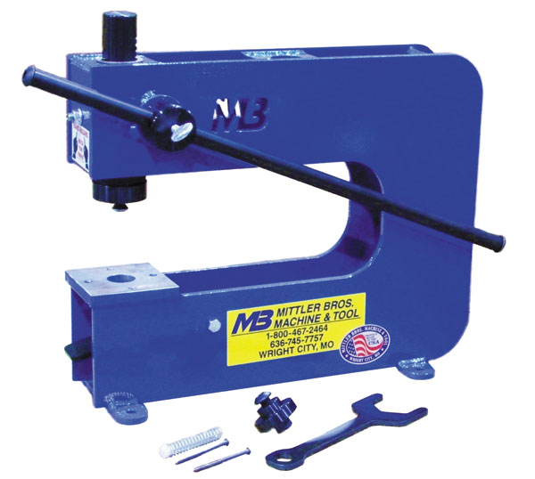 Economical and versatile bench press accepts tooling for punching round, square and oblong holes, punching louvers, creating radius corners, and shrinking or stretching metal. Punch/Flare tooling and instrument hole punches are easily mounted with included adapters. Can also be used as an arbor press. |