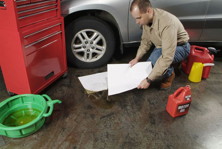 Clean up oil-based spills without wasting absorbency on water. Unlike rags or floor sweep, PIG® Water-Repellent Oil-Absorbent Mat quickly soaks up gas and oil but repels water from rain, slush, washdowns, ponds and sumps and more! |