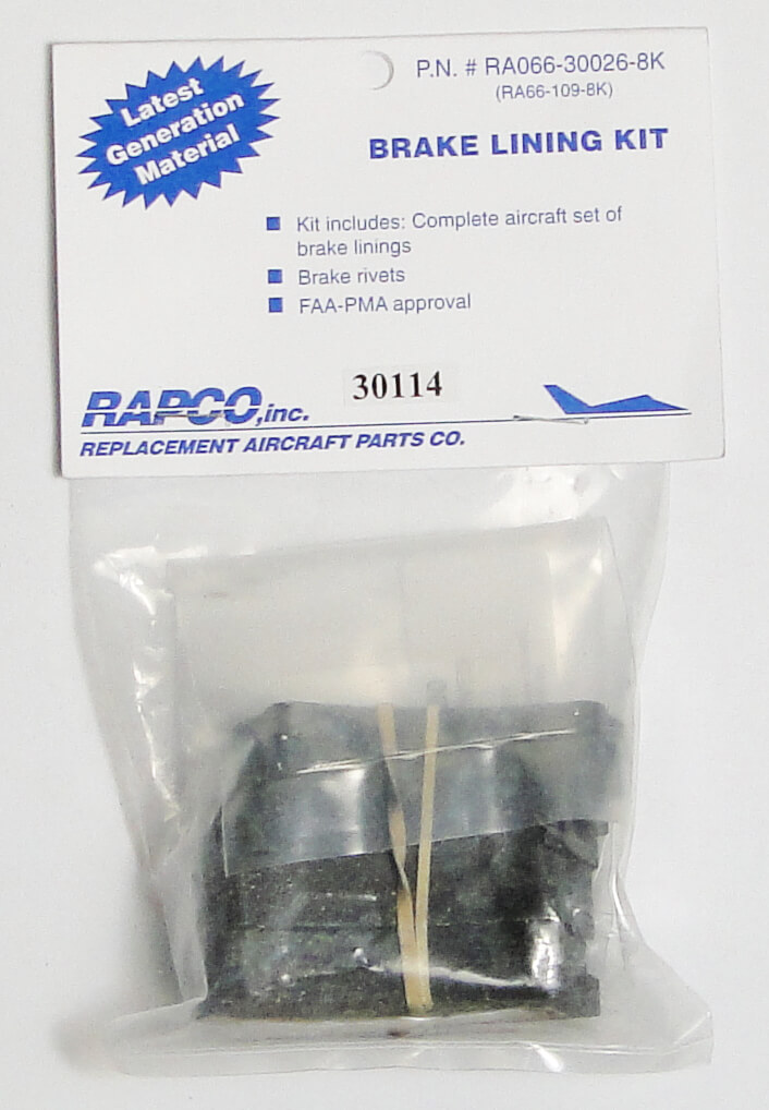 All Rapco Brake Lining kits come complete with correct number of brake linings and rivets needed for each aircraft.