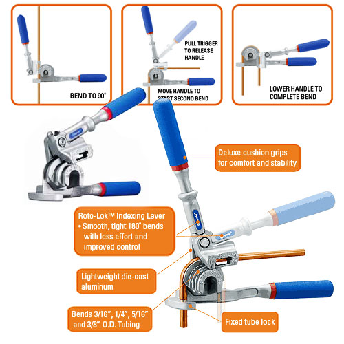 The 470-FH Triple Head 180° Tube Bender bends 4 diameters of tubing with just one tool! It handles soft copper, aluminum and thin-walled steel tubing in 3/16", 1/4", 5/16" & 3/8" diameters. Like the heavy duty 464-FH, it features the patented ROTO-LOK™ two stage handle that allows east fabrication of bends up to 180°. It also features optimized bending grooves that allow the user to bend the tubing in the smallest radius possible to enable tighter turns and minimize the space taken by the bends. The Following tubing thickness can be bent on the 470FH tube bender: • Soft copper - .030-.032" wall • 304 Stainless Steel - .030-032" wall |