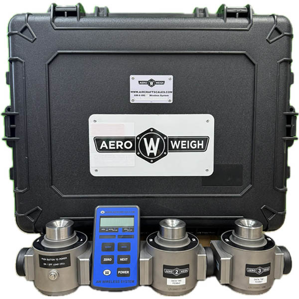 Aeroweigh AW-3-30HH Wireless aircraft weighing equipment designed for turbo props and light jets up to 10,000 lbs per jack point, wireless operations via Hand Held Transceiver with built in antenna, 3 each wireless 10,000 lb top of jack aircraft scales, standard one inch jack mounting, calibrated with OEM NIST traceable calibration, ready to use as received.