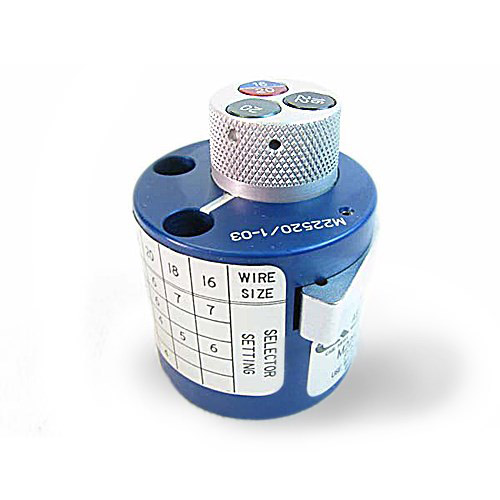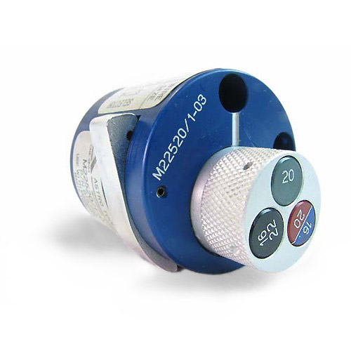 The 615710, mil spec M22520/1-03, is a turret head used with the 615708, mil spec M22520/1-01, crimp tool frame on size 20-16 pin and socket contacts installed in MIL-C-28748 connectors. |