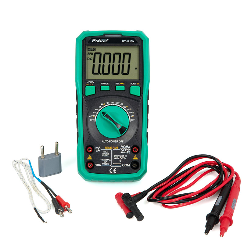 | A 3-3/4 digit multimeter featuring both manual and auto-ranging capabilities. Large digits with backlight for easy reading. Has all the features you would expect from a professional quality multimeter such as: true RMS readings for AC voltage and current, diode and transistor testing capability, precision DC voltage, DC current, resistance, capacitance and frequency reading (accurate up to 0.5%). All inputs protected against overload. Includes shock-resistant case. |