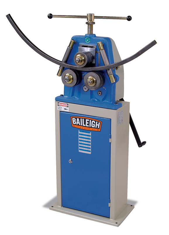 This manually powered roll bender is capable of rolling full circles because of its open face design. The R-M10 can do anything that the larger models of roll benders can. The only difference is that The R-M10 is manually powered, but it does have a reduction gearbox to assist in the bending functions.