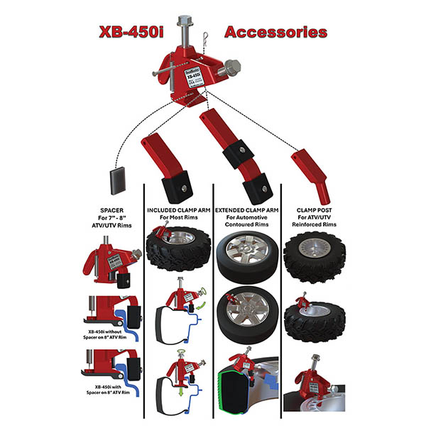 The BeadBuster XB-450i is a 2024 updated design of our original small frame bead breaker (the XB-450 – 1st released in October 2012). It is also a replacement of the other small frame tools (XB-451, 452, 454 PRO & 455). The new design updates include Premium Investment Cast construction from hardened 4140 Chrome-Moly Steel, custom Grade-8 Bolts with crowned tips, and double female ram thread length (1″). These improvements address weld and thread stripping failures that some customers experienced with the legacy design. The removable clamp arm can be swapped with other accessory clamp arms for specialty applications.