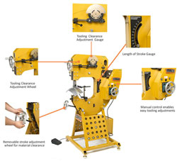 When operating in the rigid mode, there is no "give" between the die heads. Used for short stroke shaping, flanging. Tooling designs and profiles are endless, but some of the options are mechanical shrinking, stretching dies, flanging dies, and louvers. The spring setup with "Throw the die" causing a dead blow hammering effect. When in this mode the total amount of pressure applied when the dies hit the metal is increase exponentially. This mode would be used for aggressive shrinking and planishing, many different tooling profiles can be used. |