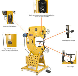 The MH-19 power hammer is a 220 volt single phase machine has the ability to transform itself from a rigid style like a Pullmax® style machine, to a spring slapping style like a Yoder® style machine, or even a very heavy duty English wheel.