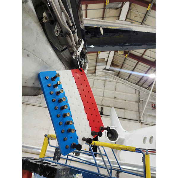 The Data: The Air Force hired a 3rd party to consult on the project as well. Independent testing had to be performed in order to validate our claims. Boeing was the consultant of choice. Because of this, our mats got put through the ringer. Chemical Resistance: Our proprietary blend of silicone was put through prolonged exposure to numerous chemicals. Gasoline, diesel, solvents, cleaners, degreaser, antifreeze, jet fuel, etc. No major deterioration was detected, only minor discoloration of the product. A true testament of quality. Drop Test: Next, the Air Force Organizer was subjected to repetitive drop tests from a 40' ledge. The results proved great retention rates with correctly sized fasteners! UV Testing: The mats were also subjected to simulated UV testing. This UV testing would simulate years of exposure over a shorter window of time. Remarkably the testing proved to have no significant signs of product deterioration. Tear Away: One primary concern with the design of the Air Force Organizer was how strong the carabiner attachment point would be. Repeat testing showed an average break away strength of 128lbs of pulling force! Repetition / Abrasion: Many tests were performed within this step. However, the repetition test was arguably the most compelling. A jig and fixture was constructed for the mat with a robotic arm to test how the organizer fared against repetitive bolt insertions. At 10,000 insertions the mat was removed and measured. Only a small amount of abrasion occurred within the tested holes, with the mats being deemed fully functional post testing! |