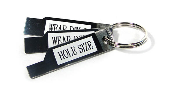 Allows for quick limit checking of seat rail hole and wear dimensions. Gage elements are made from heat treated blue tempered steel. Each element is marked to correspond to the limits set forth in the relevant ad. The three gage elements are linked together on a universal spiral key ring |