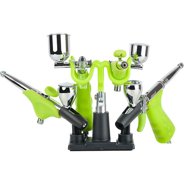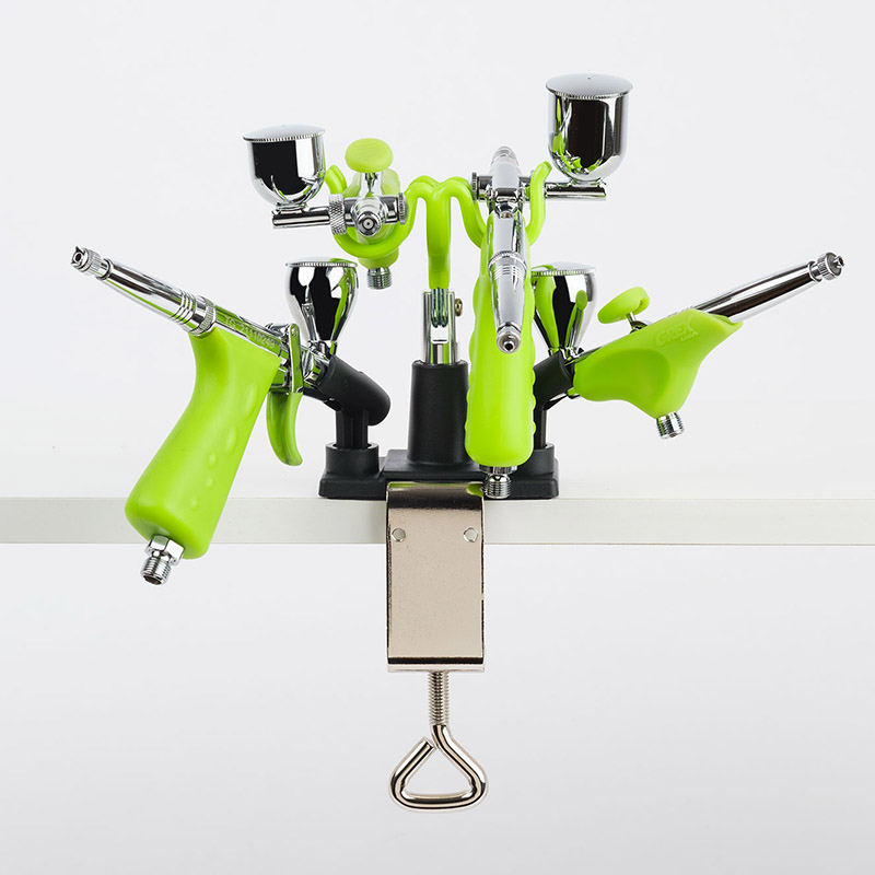 Adjustable to attach on table and bench tops. Holds up to 4 airbrushes with two rotatable bottom holders and two attached top holders that can pivot 180 deg./rotate 360 deg. |