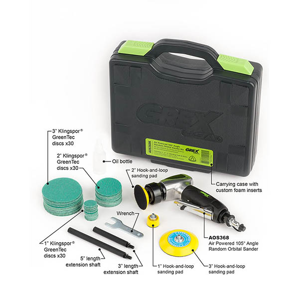 Since 2003, the popular Grex® AOS368 random orbital sander has provided proven performance for all your detailed sanding needs. Now in it’s 20th anniversary, we celebrate it’s success with the introduction of a new comprehensive kit that bundles this tool with all it’s compatible accessories plus an extensive range of premium abrasives - all packaged in a custom carrying case with foam inserts to securely protect and organize all it’s contents. This all-in-one kit gives you everything you need to quickly tackle all your projects.