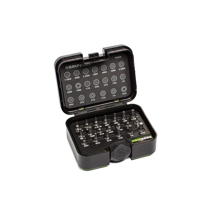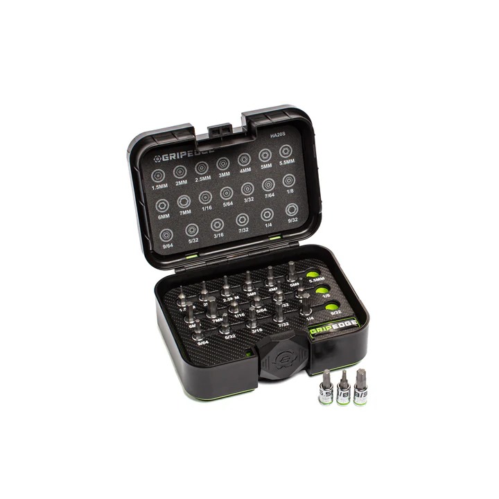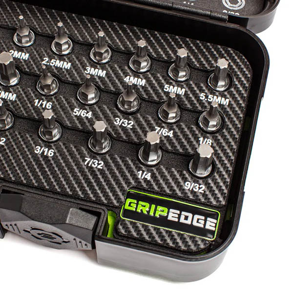 Introducing the GRIPEDGE 20-PC 1/4" Drive SAE and Metric Hex Driver Set with Rounding Prevention Technology (R.P.T.). These precision-machined S2 steel bits are designed to deliver up to 50% more torque on good fasteners and up to 400% more on damaged ones. The patented bi-directional geometry prevents rounding, ensuring reliable performance. The set includes sizes from 1.5 to 7 MM and 1/16 to 9/32”, perfect for automotive and industrial applications. Each socket features clear-size markings and nickel chrome plating for corrosion resistance, all housed in a premium case with a removable foam insert. |