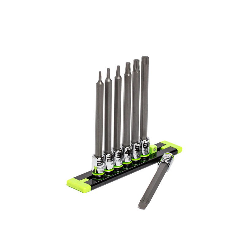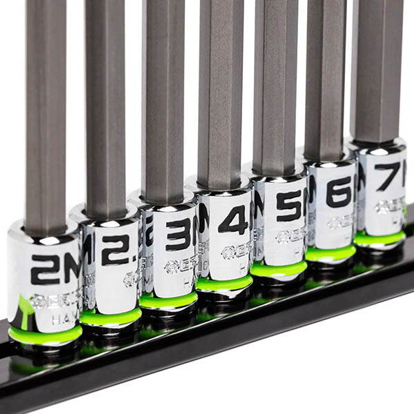 Introducing the GRIPEDGE 7-PC 1/4" Drive Long Metric Hex Driver Set with R.P.T. (Rounding Prevention Technology). Designed to replace standard tools, R.P.T. Technology offers up to 50% more torque on good fasteners and up to 400% more on damaged ones. Precision machined from S2 steel, these hex-bit sockets are corrosion-resistant and feature 4” lengths for better access to hard-to-reach areas. The set includes sizes from 2 to 7 MM, perfect for most automotive applications, and comes on a premium aluminum socket rail. |