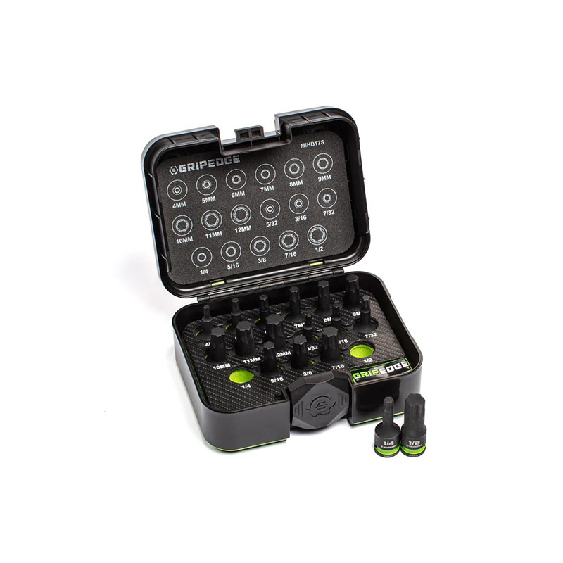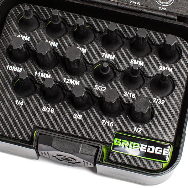Introducing the GRIPEDGE R.P.T. (Rounding Prevention Technology) 17-PC master 3/8” Drive Impact Hex Set. Engineered to replace standard hex tools, this set features a patented bi-directional design that prevents rounding and delivers up to 50% more torque on new fasteners and up to 400% more on damaged ones. Each bit is crafted from Cr-Mo steel for enhanced strength and durability, with oversized, laser-etched markings for easy identification. The 17-piece set covers a range of sizes (4-12mm and 5/32-1/2”), making it perfect for automotive and industrial applications, and comes in a premium plastic case with a removable foam insert. |