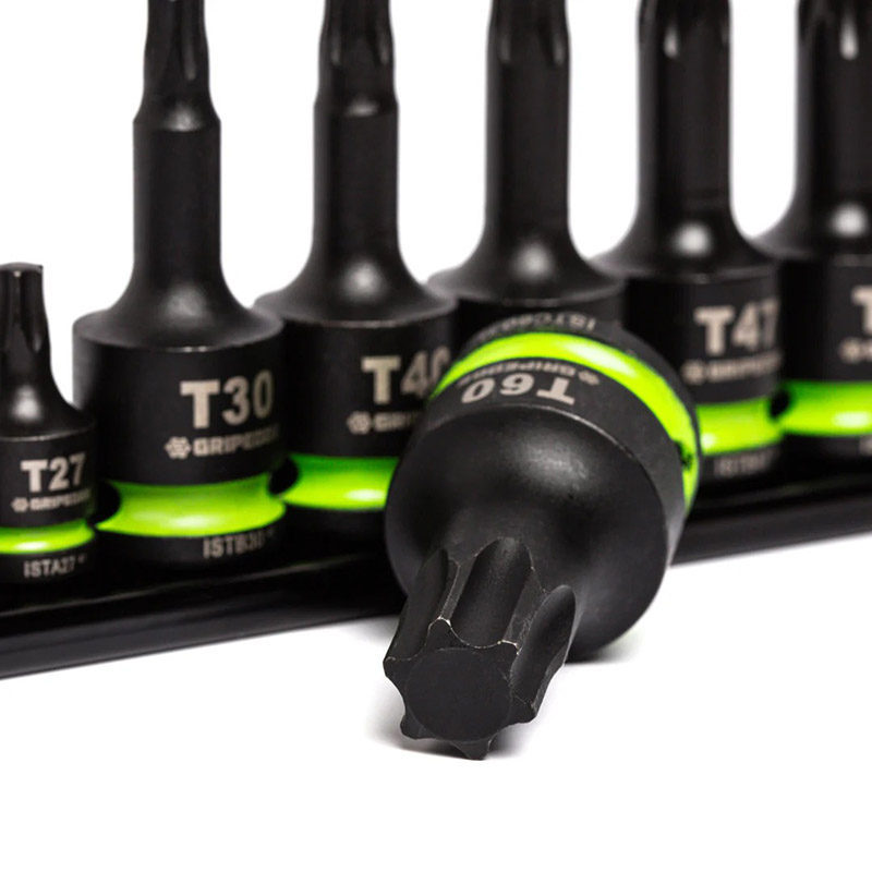GRIPEDGE - “ITS ALL ABOUT THE GRIP” GRIPEDGE R.P.T. (Rounding Prevention Technology) Impact Star bit sockets are designed to replaced standard star tools. R.P.T. Technology provides up 50% more prevention torque on good fasteners vs standard tools, whilst applying up to 400% more torque on damaged fasteners vs standard tools. The unique, patented, & bi-directional geometry prevents the rounding of good fasteners whilst being able to remove extremely compromised fasteners. Compromised fasteners can be re-inserted in a pinch if a suitable replacement is not available. Each bit is precision machined from Cr-Mo steel for increased strength and durability as well as coated for increased corrosion resistance. All sockets have oversize, laser etched size markings for greater visibility, and manganese phosphate coating for corrosion resistance. |