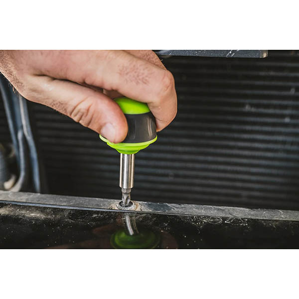 • 60 Tooth ratcheting screwdriver with 12-bit storage holder inside of the handle and stubby screwdriver
