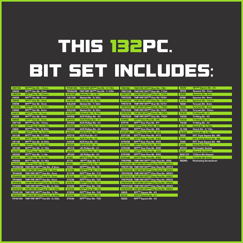 • RPT Hex bits – 1.5, 2, 2.5, 3, 4, 5, 5.5, 6, 7, 8, 9, 10mm & 1/16, 5/64, 3/32, 7/64, 1/8, 9/64, 5/32, 3/16, 7/32, 1/4, 9/32, 5/16, 3/8”