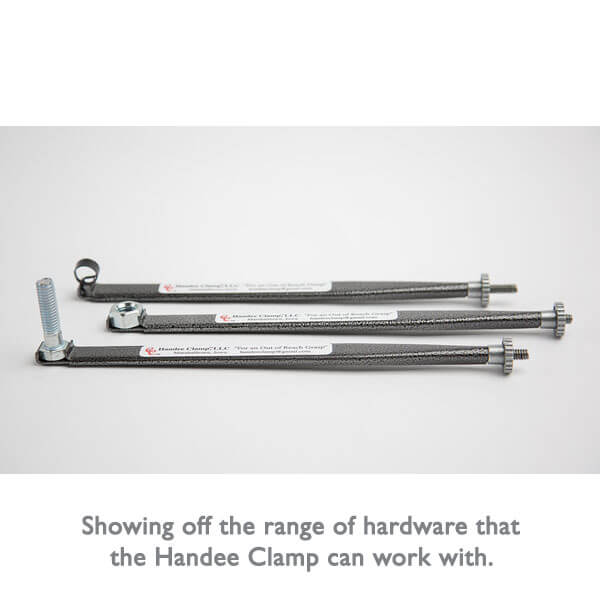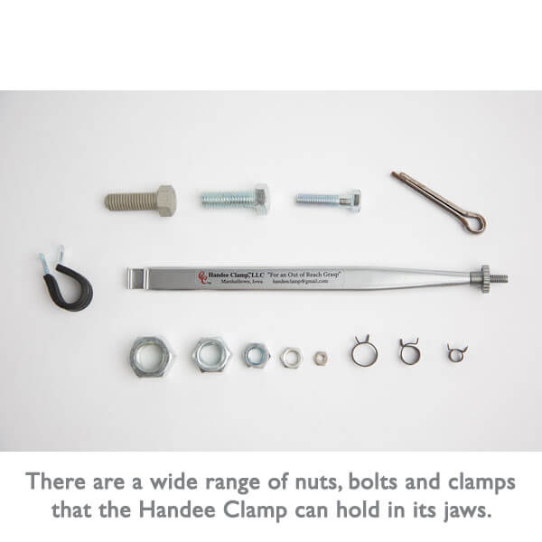 This innovative tool solves the problem of that out of reach grasp. Have you ever been working on a job where you needed to put a clamp, nut, or bolt on something that was just out of reach of your fingers or another bulky tool? The Handee Clamp makes that job easy. Simply put that nut, clamp, or bolt on one end and then tighten the nut on the other end to secure. Designed to firmly hold nuts, bolts, and clamps in its easily adjustable jaws, the Handee Clamp acts as a small, versatile vise grip enabling you to focus on the job at hand. You won't have to worry about dropping that nut or bolt into that pesky floor drain ever again, or fight with that hose clamp as you work on that transmission line. From a professional auto or aviation mechanic, to a do-it-yourselfer that always has a project on deck in your garage at home, you need this tool in your inventory. |