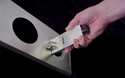 Noah Industries has introduced the Joggle-360 into its lineup of innovative metal aircraft fabrication tools. The Joggle-360 will joggle round openings for inspection plates with joggle widths up to 0.562 inch and straight joggle offsets up to 0.625 inch. The tool features hardened steel rollers that form the joggle while gliding around the opening or along the edge by ball bearings that eccentrically adjust for joggle width. 1. Adjust the guide rollers to the desired set back or width of joggle by rotating the Eccentric Guide Roller Adjustment Screws with an Allen wrench. |