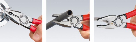 Gripping zones for flat and round material, suitable for versatile use with cutting edges for soft and hard wire. Long cutting edges for thicker cables