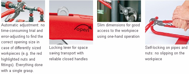 Automatic adjustment per one-hand operation both for right-handed and left-handed use with good access to the workpiece thanks to the slim dimensions in the head and joint area and flush joint bolt. Self-locking on pipes and nuts: no slipping on the workpiece and low handforce required. Gripping surfaces with special hardened teeth, teeth hardness approx. 61 HRC: low wear and stable gripping box-joint design: high stability because of the double guide. Guard prevents operators’ fingers being pinched and locking lever for space saving transport with reliable closed handles. Chrome vanadium electric steel, forged, oil-hardened Adjustment to suit the workpiece is automatic with the KNIPEX SmartGrip®! Place the outer jaw on the workpiece, squeeze the handles - turn! |