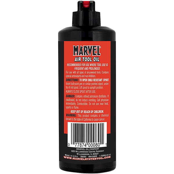 Marvel brand oil, especially engineered for care of piston-type and rotary air tools. Prevents rust formation while providing lubrication for longer tool life and smoother operation. Keeps your air tools in top shape. A "must" for all air tools. 4 oz. bottle with spout. |