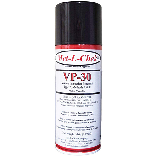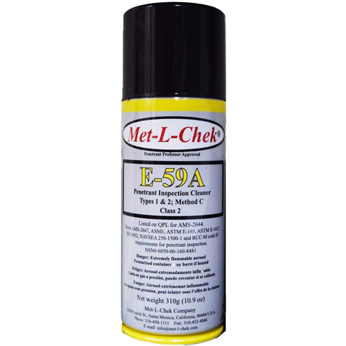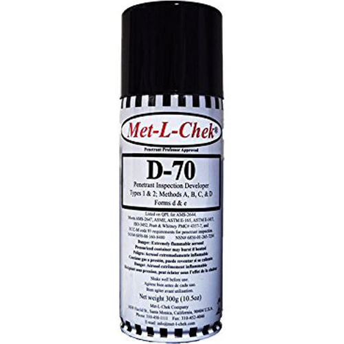 Met-L-Chek kits provide a completely portable,job-proven method used throughout the industry to locate cracks, flaws and other defects. These economical and effective kits provide everything needed to make inspections in the shop or field. The penetrant materials are packaged in easy-to-use aerosol spray cans and a can of cleaner included for cleaning parts before inspection. The inspection procedure is easy to learn, accurate and inexpensive. Met-L-Chek can be used on ferrous and non-ferrous materials to find surface defects and ‘thru leaks’. Supplied in a rugged metal case with complete instructions. They are low in sulfur, chlorine, and other halogens, making them safe for use on Titanium and high Nickel alloys in nuclear applications. Visible inspection penetrants are used primarily for field applications were darkening the inspection area and the use of a black light (UVA) is impractical, in maintenance repair and safety checks, and in manufacturing processes where a visible indication helps in locating the area for subsequent repair work, such as in large rough castings. Visible penetrants are also used for weld inspection and through leak testing of heat exchangers and tanks, where penetrant is applied to one side and developer to the other. 4 Can Kit includes: