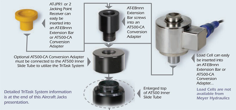 This Series has an ultra-low design that provides maximum single stage stroke while maintaining excellent stability throughout the lifting range. These Aircraft Jacks are ideal for low-slung airplanes and helicopters weighing up to 8000 lbs. (3629kg). A: INNER SLIDE TUBE - The 2.5" (64mm) diameter powder-coated Tube forms the foundation of the TriTask Aircraft Jack System. The zigzag pattern of safety lock-out holes are vertically spaced 1" (25mm). A 1.25" (32mm) round Jacking Point receiving socket is at the top of the Tube's anchoring stud.