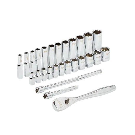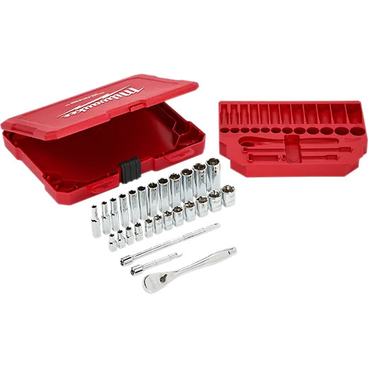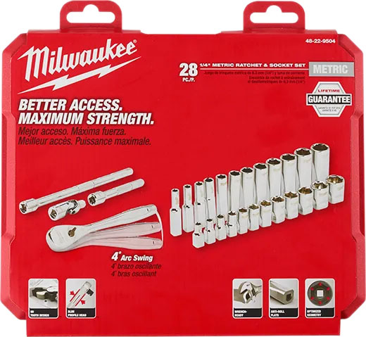 Our MILWAUKEE® SAE 28 piece 1/4" drive Ratchet & Socket set is designed from the ground up, offering our users the Most Versatile Sockets that are Anti-Roll and Wrench-Ready.