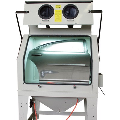 The Monster Blast Cabinet is constructed of 14-gauge steel for strength and durability. It features a built-in dust collector and large work area to handle bigger pieces. Foot pedal control and side-mounted light switches for easy control. What's included: