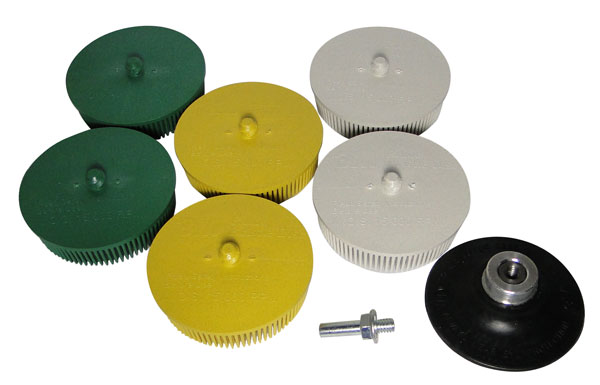 This convenient introductory 3M™ Roloc™ Bristle Disc Kit contains 3" bristle discs in three grades: 50, 80, 120. Finer grades are recommended for light-duty applications, like finishing and polishing, and coarser grades are recommended for heavy-duty applications like grinding and deburring. A 3" Roloc TR Disc Pad Holder is also included in the pack. The disc pad optimizes performance of the bristle disc by providing a secure attachment for all applications. Plus, it saves time by eliminating the need to align edges of the disc with the disc pad — the screw aligns the disc, making disc changes quick and easy. The versatile system works with drills, disc sanders, right angle grinders and rotary sanders. |