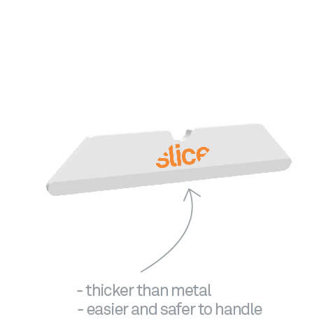 Three-position manual pen cutter includes one replaceable Slice ceramic safety blade. Patented handle with rubberized slider button limits the amount of exposed ceramic-blade to further reduce injuries. Three positions including fully-retracted. Patented high-tech double-sided Slice ceramic blade designed to reduce injuries by incorporating a safer rounded-tip. Sharpness level up to 10x longer than steel. Measures 135 mm L x 18 mm diameter (5.3 in L x 0.75 in diameter). |