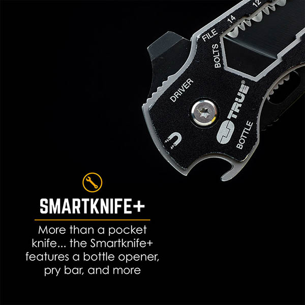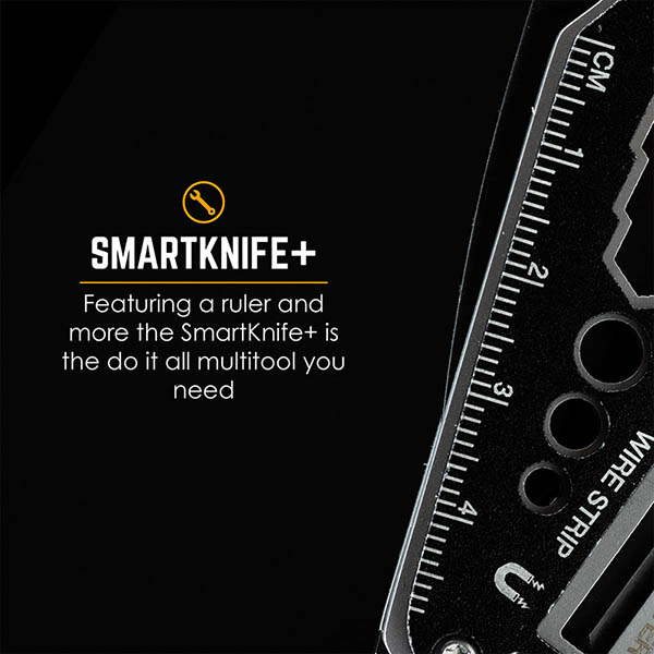 The SmartKnife+ is a multi-tool wrapped around a super sharp 2.375” black oxidized pocket knife. The multi-tool handle features a small, medium and large flat driver, magnetic ¼” bit driver and holder, file, wire strippers, rulers, wrenches, pry bar, pocket clip and bottle opener, making this the smartest knife you can put in your pocket.