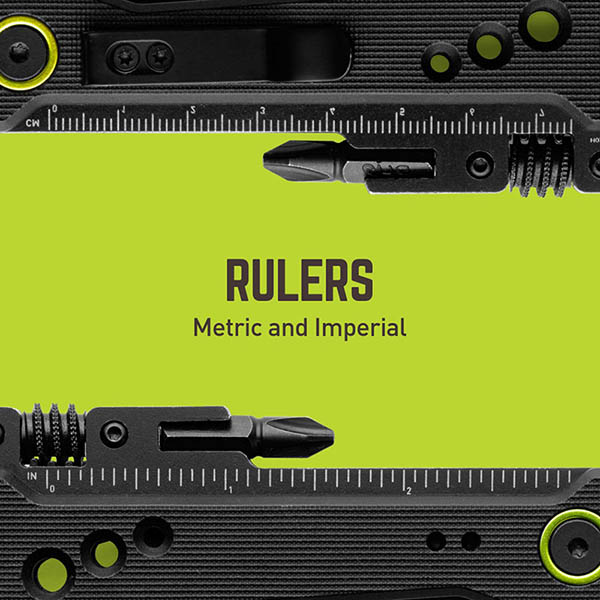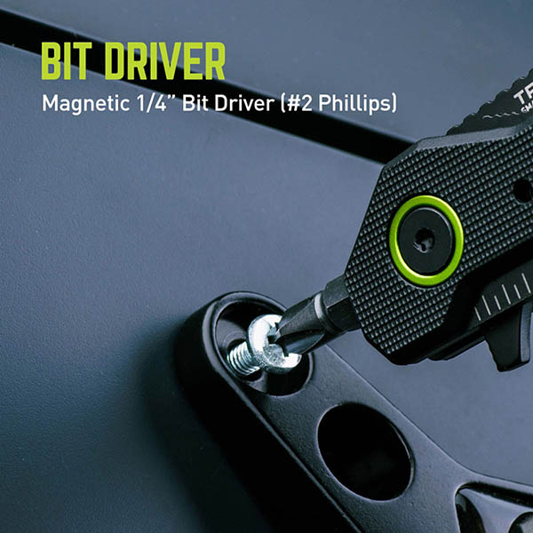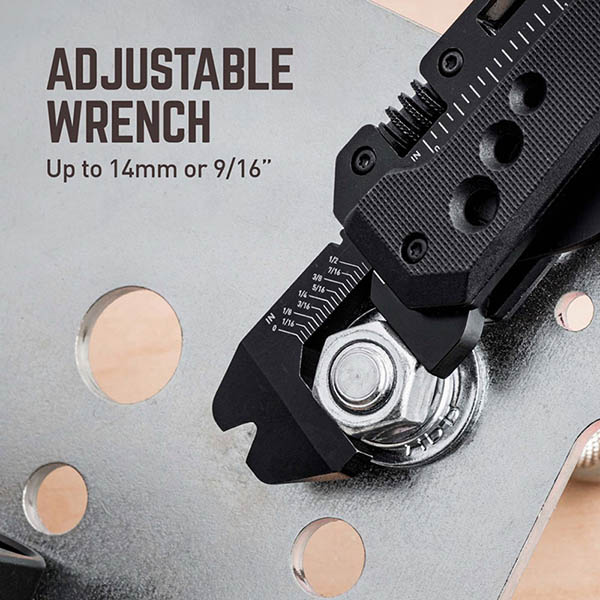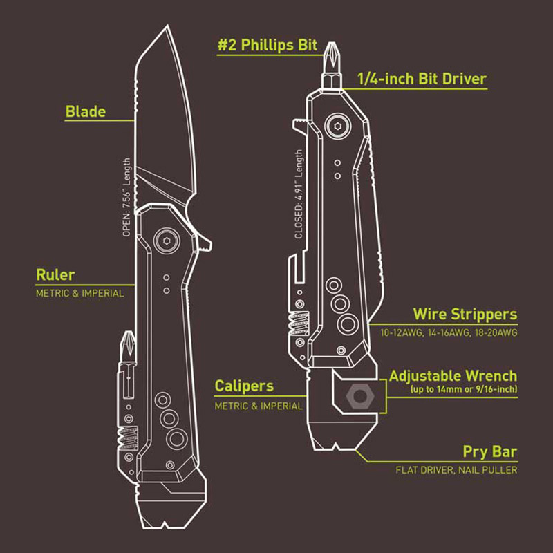 The SMARTKNIFE WR features a 2.5" black oxidized Sheepsfoot blade cleverly wrapped in an assortment of multi-tools. This 8-in-1 multi-tool knife is equipped with an adjustable wrench, calipers, magnetic 1/4" bit driver, wire strippers, rulers, flat driver, and a pry bar, making this the smartest knife you can put in your pocket. |