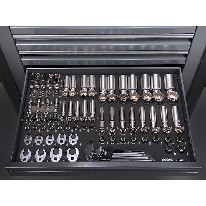 | In this toolset are 1/4", 3/8" and 1/2" SAE sockets that range from 3/8" all the way up to 1-1/4". This set also includes shallow and deep-well sockets and crows feet. Sonic sockets are made from Chrome Vanadium steel while socket bits are made hardened tool steel. Also included in this 121-piece set are SAE Hex bits from 3/16" to 5/8", and you get a 10-piece Hex-key set that includes sizes from 1/16" to 3/8". |