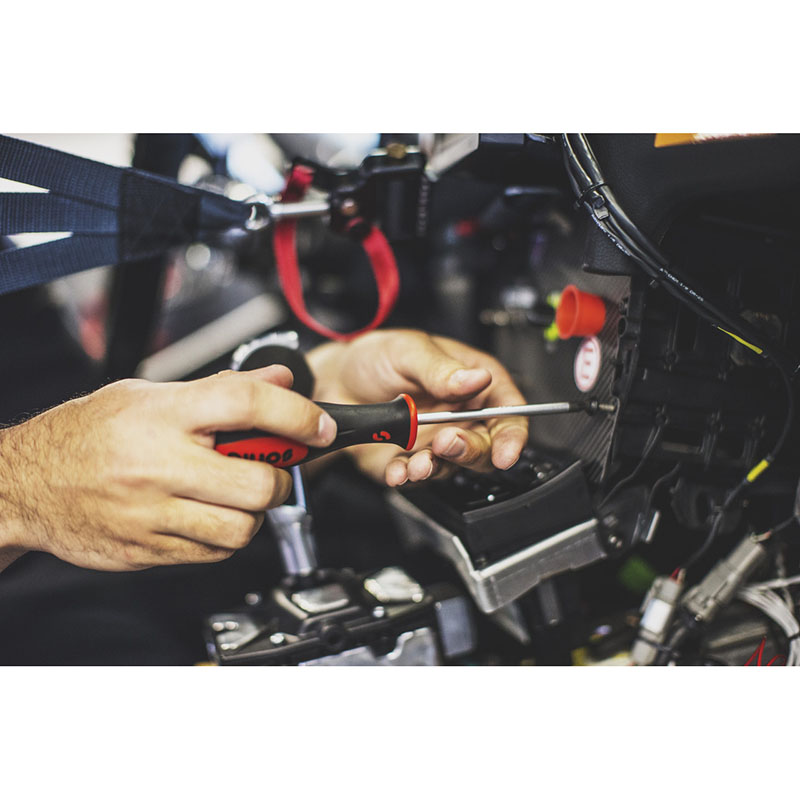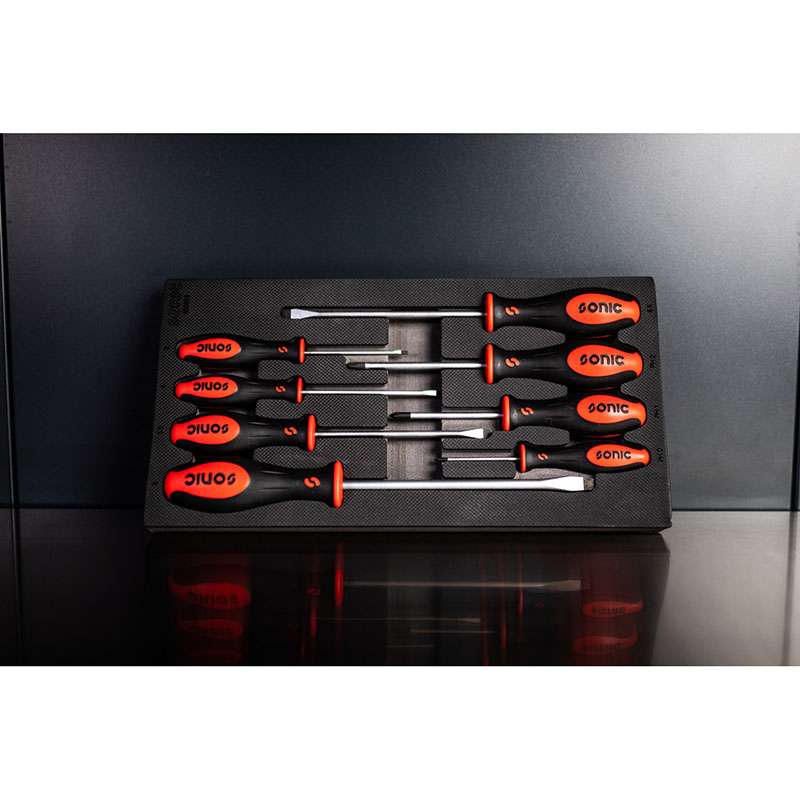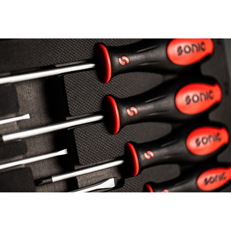 The Sonic 8-piece screwdriver set is a necessity. Sonic screwdrivers feature a bi-material handle (polypropylene and thermoplastic vulcanizate) that are ergonomically designed for comfort as well as maximum power. Chrome Vanadium shafts ensure durability for years of use, and a hardened tip offers maximum gripping power. In the Sonic Foam System, tools are stored in a well-organized, chemical resistant, CNC machined foam inlay. They are quickly accessible for fast workability, ergonomically laid out, and feature a two-tone color system for convenient survey of missing tools. Sonic screwdrivers are available in 3 different styles- standard, stubby, and extra-long. Sonic screwdrivers include ergonomic tri-lobe plastic handles with a rubber overmold for a comfortable grip. (600823, 600823-CE). |