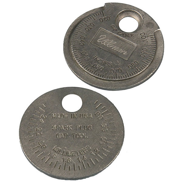 Provides easy accurate spark plug adjustment. Features flanged edge for electrode bend- ing and beveled round hole for opening gap. 1.5" dia. Wt.: 0.8 oz. Scaled from .020" to .100". Pewter plating makes the inches more legible for user to read. Also available in metric scale (0.5 mm to 2.4 mm). |