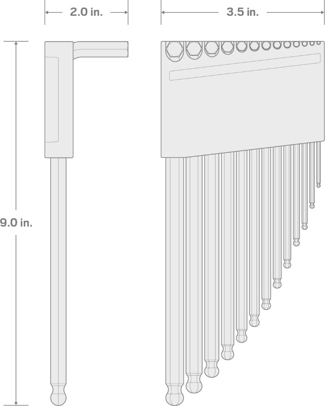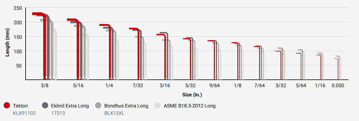 High Leverage We designed the keys to be longer to increase leverage where it matters. ![]() Tight Fit with Fasteners We precisely manufacture our hex key geometry on the large end of the applicable range, resulting in less slop in fasteners. ![]() Two Measures of Tolerance Control We measure our hex key tolerances in two ways, from point-to-point and side-to-side, to ensure the highest standards of dimensional accuracy and consistency 20º Ball Angle Increases Access Our keys implement a steep ball end angle that increases your ability to access fasteners while still maintaining sufficient strength. ![]() Refined Edges Tekton keys have slightly chamfered edges (except sizes that are too small to be chamfered: 1.3 mm, 1.5 mm, 2 mm, 0.050 in., 1/16 in., and 5/64 in.) and a smooth top face to optimize engagement with fasteners. ![]() Materials and FinishesMaximum Torque Strength We make our L-keys with 8660 nickel chromium molybdenum steel that's heat-treated to 54-58 HRC to produce tools that are hard, but not brittle. As a result, the maximum torque of the L-keys consistently exceeds the ASME standards for minimum torsion load and the ISO standards for minimum proof torque. ![]() Corrosion-Resistant Finish We coat all of our keys with a durable manganese phosphate finish that’s resistant to corrosion. ![]() Clear Markings With the exception of the smallest sizes, Tekton L-key sizes are marked in two ways—both with a high-visibility laser marking and a stamped marking. ![]() Orginization FeaturesQuick Access We designed the holder to organize the L-keys facing forward so you can easily access each tool without having to move others out of the way. ![]() Low-Profile Organization You can also face the L-keys to the side for a flat, low-profile organization solution. ![]() Self-Aligning Key Slots The slots are uniquely shaped to guide the head of each L-key into alignment with the others. Durable Material The holder provides a firm, flexible grip and resists cracking or breaking. ![]() |