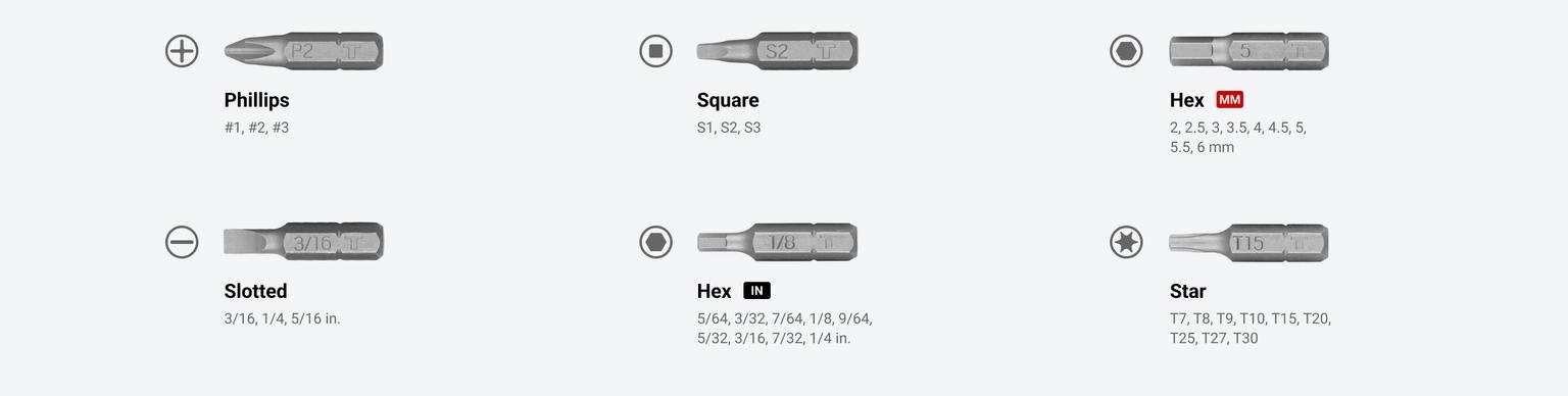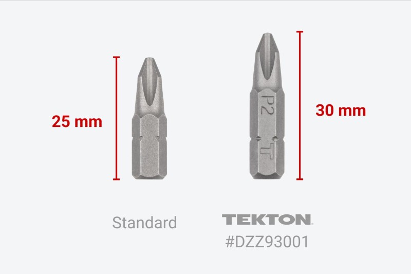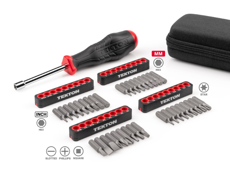 Bit Sizes Included ![]() Extra Length While standard bits are 25 mm long, every bit in this set is 30 mm long to improve your access to recessed fasteners. ![]() Corrosion Resistant The bits are made of S2 steel heat-treated to HRC 58-62. They're coated with a zinc-phosphate coating that resists corrosion. ![]() Clear Markings The tip size and Tekton “T” is clearly stamped onto every bit. ![]() Free-Standing Bit Rails The flexible rails securely grip the bits so they can’t fall out, while also making it easy to remove any bit one-handed. The rails can also stand upright on a surface. ![]() ![]() Full-Sized, Comfortable DriverMagnetic Bit ReceiverThe bits are held onto the end of the driver by a magnet that’s friction-fit within the receiver so that it can’t fall out. ![]() Three-Sided Geometry for Torque The handle’s three-sided geometry provides the leverage you need to generate high turning force by hand. ![]() Rounded Areas for Quick Spinning Round sections at the front and back ends of the handle create an ideal shape for quickly spinning long fasteners. ![]() Durable, Nonslip Handle The overmolded grip is permanently bonded to the handle and won't degrade or become sticky over time. ![]() ![]() Compact Carrying Case Round sections at the front and back ends of the handle create an ideal shape for quickly spinning long fasteners. ![]() |