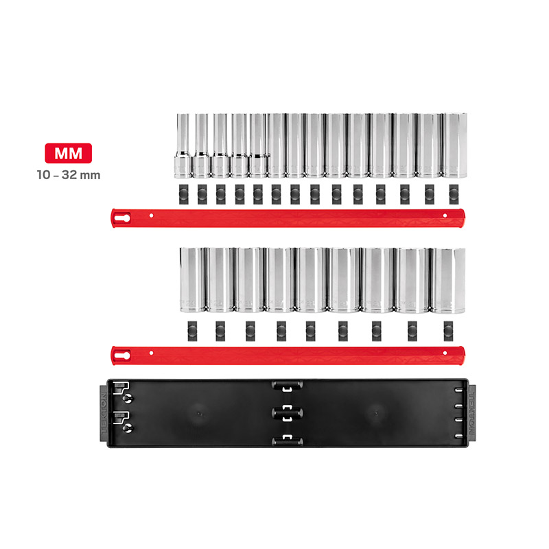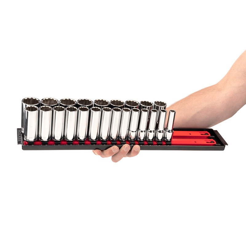 Large, Stamped Markings - Permanently impressed into the material by a roll-stamp die. - As large as possible while still being readable along the socket's curved surface - Clearly visible size numbers with extra-deep outline ![]() Fully Stepped Shoulders Narrowed diameter stretches to the base of the socket on small, deep-length sizes. This provides greater reach into tight, recessed areas. ![]() ![]() Exterior and Interior Finishes - Chrome-plated exterior is highly corrosion resistant and wipes clean to a mirror finish - Interior is protected against rust with clear coat, rather than commonly-used metallic paint ![]() 12-Point Socket Opening Get more access positions for multiple types of fasteners. ![]() ![]() Prevents Fastener Round-Off Radiused corners prevent fastener round-off by applying force to a fastener's flat sides, rather than its corners. ![]() Secure Drive Tool Engagement Detent grooves and beveled edges provide a smooth and secure connection with the drive tool. ![]() High Torque Strength Meets minimum value of 1.2 times the ANSI standard for Proof Torque. Verified by a single-cycle test that applies torque until specified value is reached without failure or permanent deformation. ![]() Carrying Case - High-density polyethylene material withstands common lubricants, fuels, and solvents - Carrying handle, strong latches, and metal hinge pins - Molded size markings for each tool and a deep parts tray ![]() |