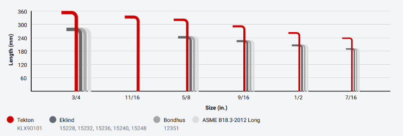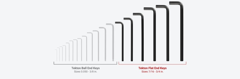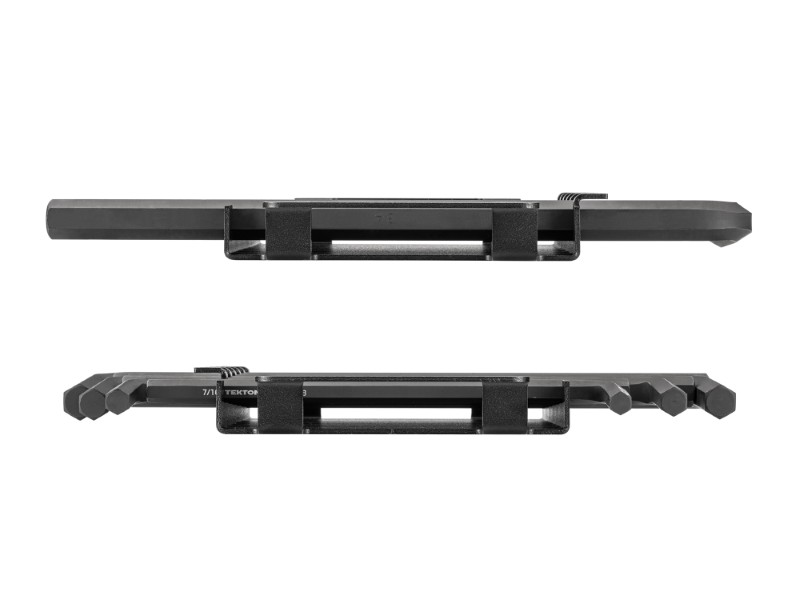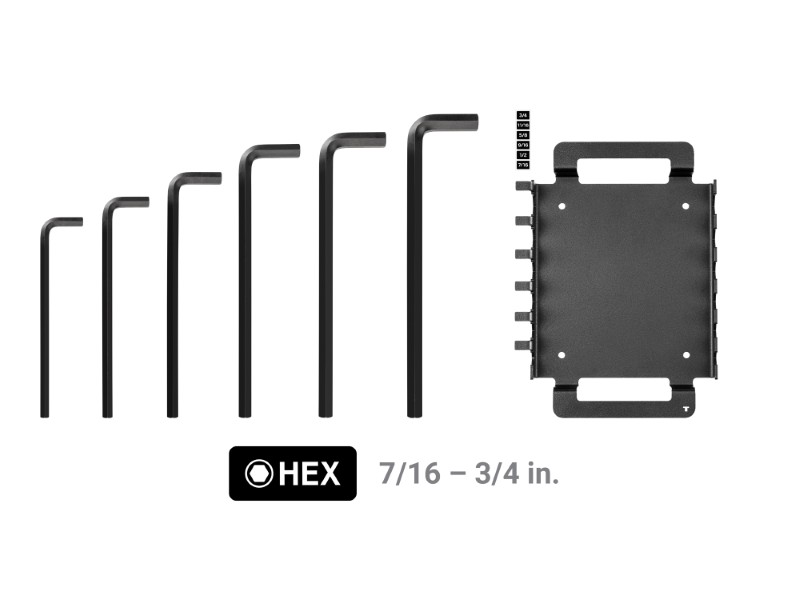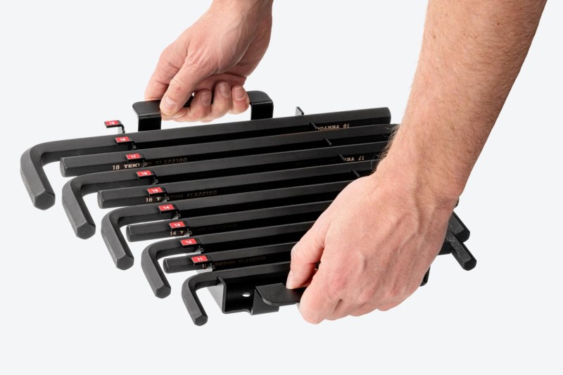 Large Key Sizes ![]() High Leverage We designed the keys to be longer to increase leverage where it matters. ![]() Two Measures of Tolerance Control We measure our hex key tolerances in two ways, from point-to-point and side-to-side, to ensure the highest standards of dimensional accuracy and consistency. Materials and FinishesMade From 6150 Steel We make our keys with 6150 chromium vanadium steel that's heat-treated to 44-50 HRC to produce tools that are hard, but not brittle. ![]() Corrosion-Resistant Finish We coat all of our keys with a durable manganese phosphate finish that’s resistant to corrosion. ![]() Clear Markings Tekton L-key sizes are marked in two ways—with a high-visibility laser marking and a stamped marking. ![]() Storage FeaturesQuick-Access L-Key Slots The keys rest in slots, making it easy to take the tools in and out without resistance. Each slot is made to fit a specific L-key size. ![]() ![]() Easy to Lift Handles on either side of the rack make it easy to lift out of a drawer. ![]() Materials The rack is made from 12 gauge steel with a textured powder-coat finish. ![]() |